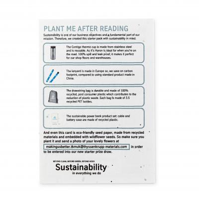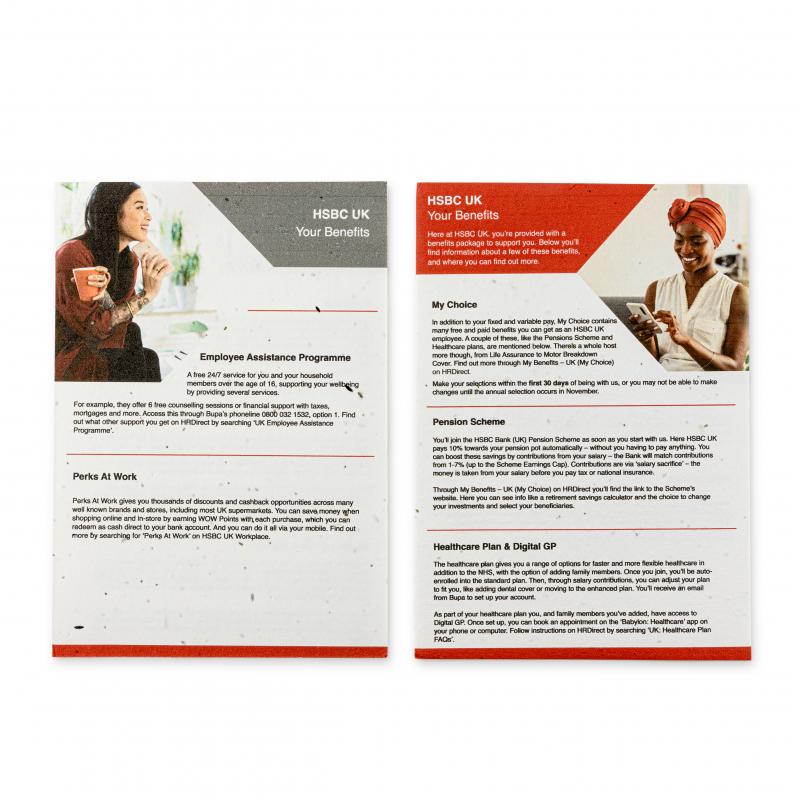 Designed for impact, our A5 seed paper offers a tactile and visual experience that goes beyond traditional paper. This eco-conscious alternative not only conveys your message but also turns into a living garden of wildflowers, keeping your brand memorable. A brilliant choice for sustainable marketing.Ideal for promotional flyers, unique event menus, or standout programmes, our A5 seed paper turns your single-sheet marketing into an eco-conscious statement. Watch your brand message blossom into vibrant wildflowers.Sustainably Printed. Our A7 seed paper is high quality, recycled 220gsm plantable paper produced from waste material originating from the textile industry. We print each sheet in-house right here in the UK, minimising our carbon footprint while ensuring your message grows into a lasting, beautiful wildflower display.Grow Anywhere, Anytime. Our seed paper is exceptionally versatile, making it a perfect fit for garden beds, flower pots, and planters. So, if you're confined to a flat or perhaps living on a hypothetical spaceship, you can still enjoy the blooms. Just plant, water, and watch your flowers grow.Customise with Your Brand. Get your message across clearly with full-colour printing options on one or both sides of this seed paper, amplifying your brand's commitment to both quality and sustainability.Paper Dimensions: 148 x 210mm. Paper Weight: 220gsm