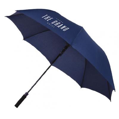 30 inch automatic opening vented golf umbrella with a fibreglass shaft and thick fibreglass ribs, a black rubber golf grip handle and a soft feel poly pongee canopy. Umbrella contains vents allowing wind to blow through (preventing the umbrella turning inside out). Open Size: 1340mm (wide) x 1000mm (high). Available as plain stock, screen printed or transfer printed on all panels.