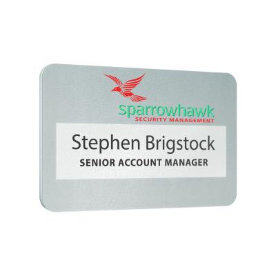 UK manufactured digitally printed aluminium name badge with clear dome finish. Supplied as standard with bar pin or dual pin/clip fitting. Can be supplied with a magnetic fitting for additional costs. Price includes personalisation. Choice of 12 standard shapes/sizes and various aluminium finishes. Supplied on plastic free packaging.