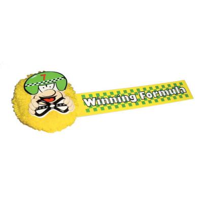 Mophead pom with card face, helmet and steering wheel attached Ribbon attached with your promotional message printed in full colour